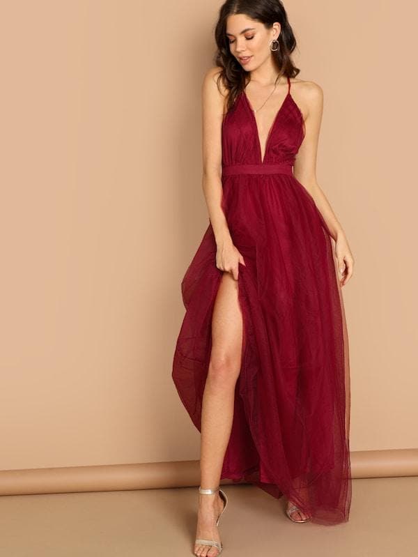 100% Polyester Plunging V Neck Crisscross Back Cami Black Dress