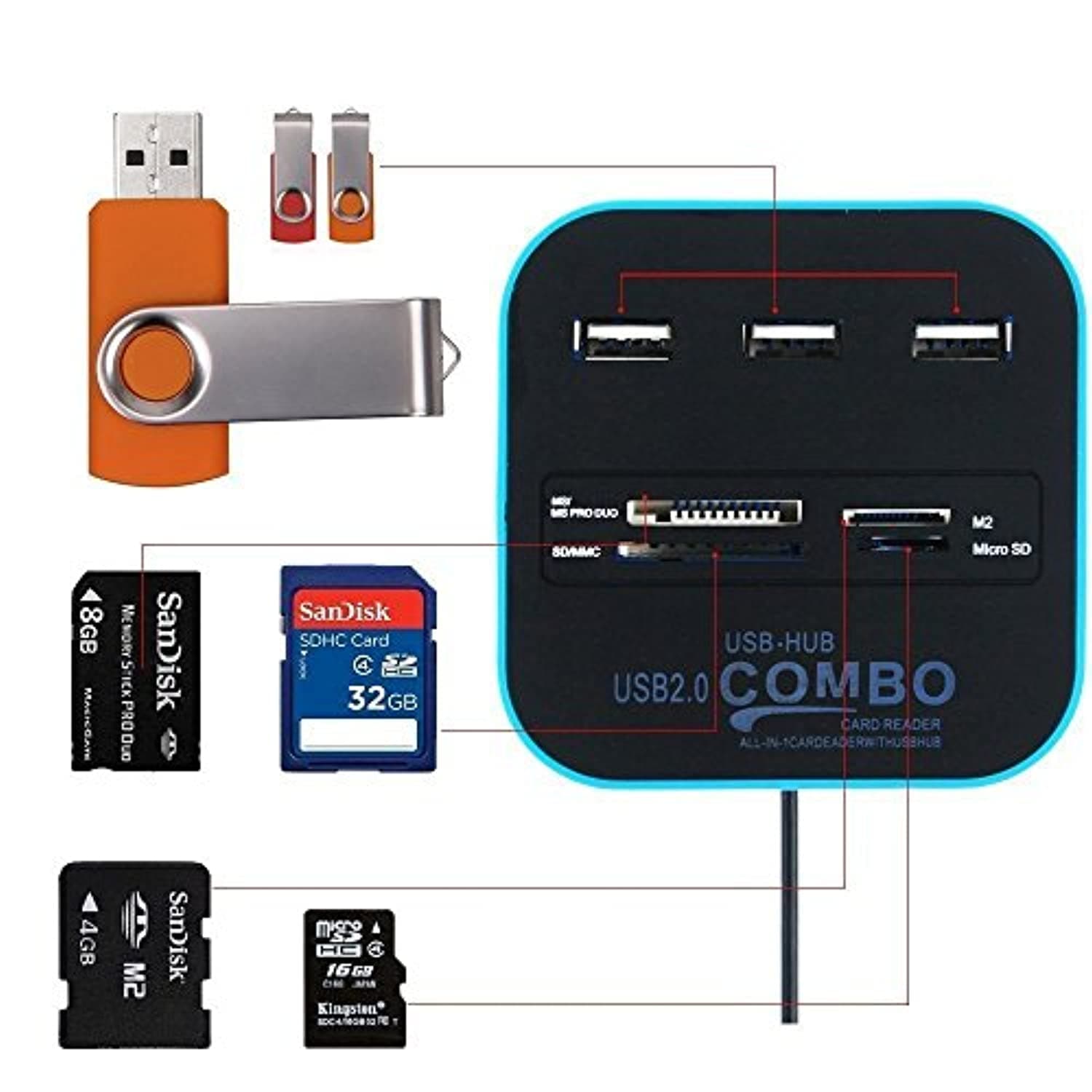The Rts (Radhey Techno Servies) Supports: T-Flash card, MS, MS Pro, MS Duo, MS Pro Duo, Mini SD, SD, RS, MMC, Micro MS- M2 The Rts (Radhey Techno Servies) All In One COMBO Card Reader is PLUG AND PLAY 3 USB Hub With High speed USB 2.0 Connectivity High transfer rate of up to 480 Mbps