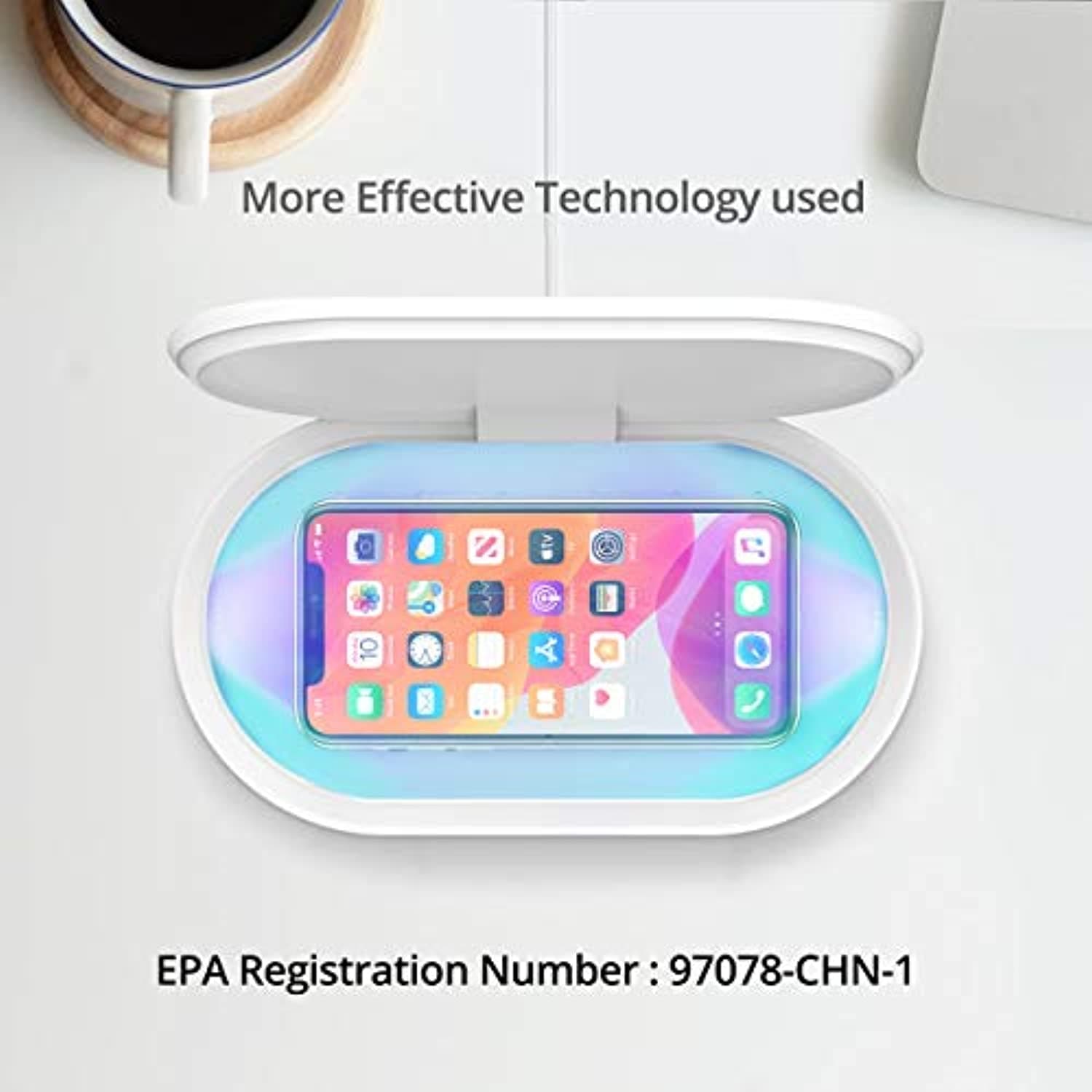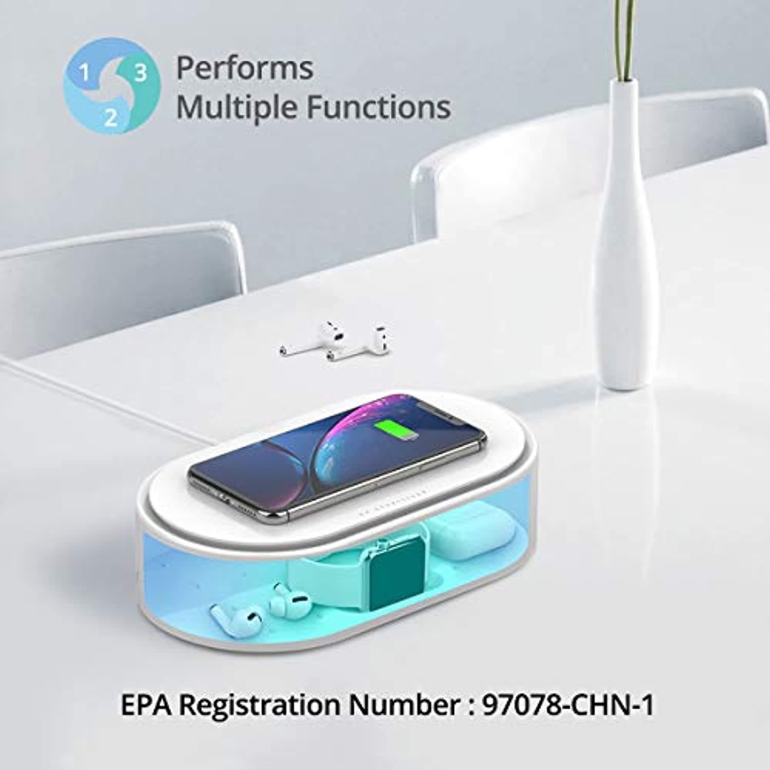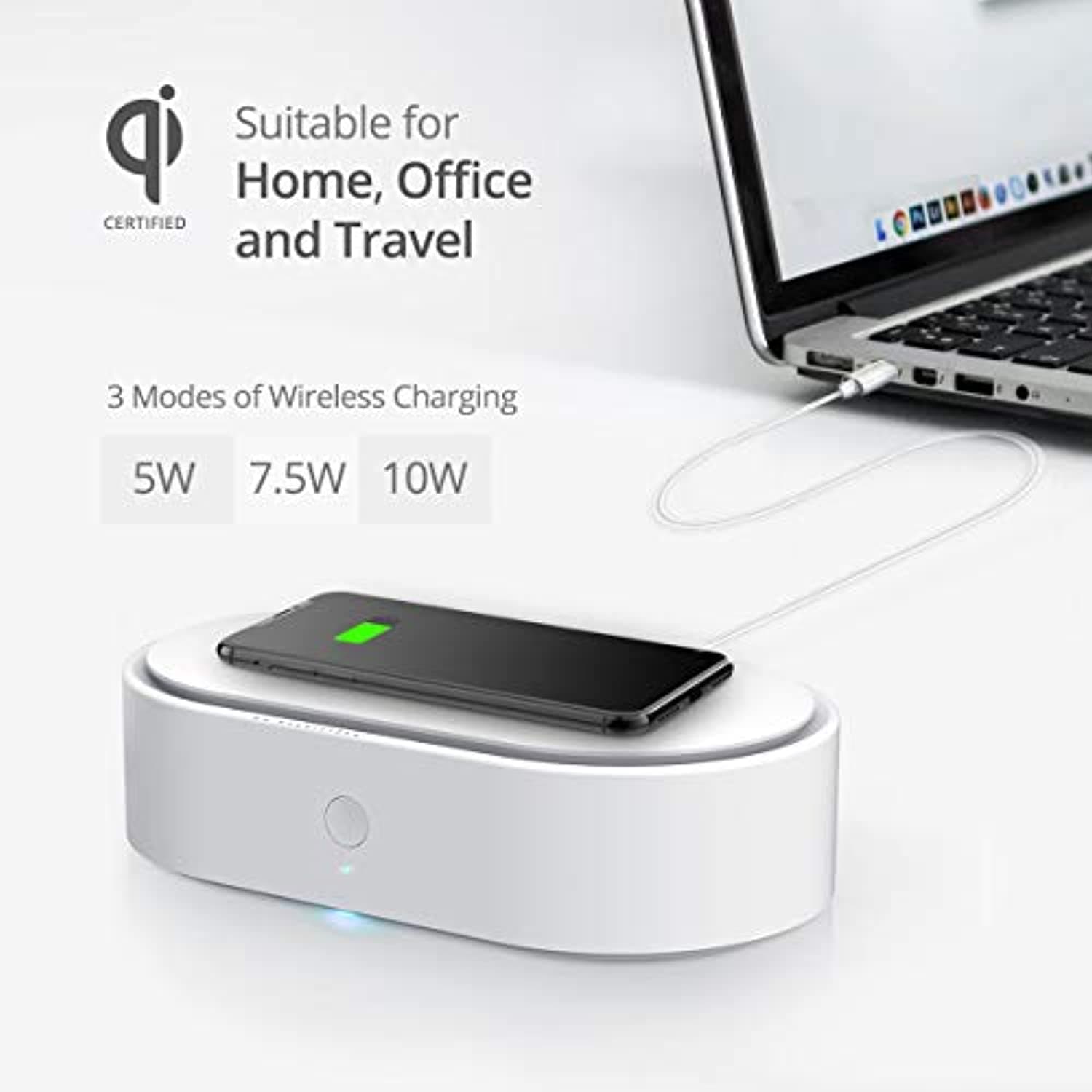 Three Modes of Fast Wireless charging : 10W / 7.5W & 5W. Compatible with all Qi enabled Phones. Universal UVC sterilizer uses ultraviolet LED tubes to eradicate 99.9% of germs, viruses & bacteria without harmful chemicals.Useful for Masks, Phones and fits other personal items.