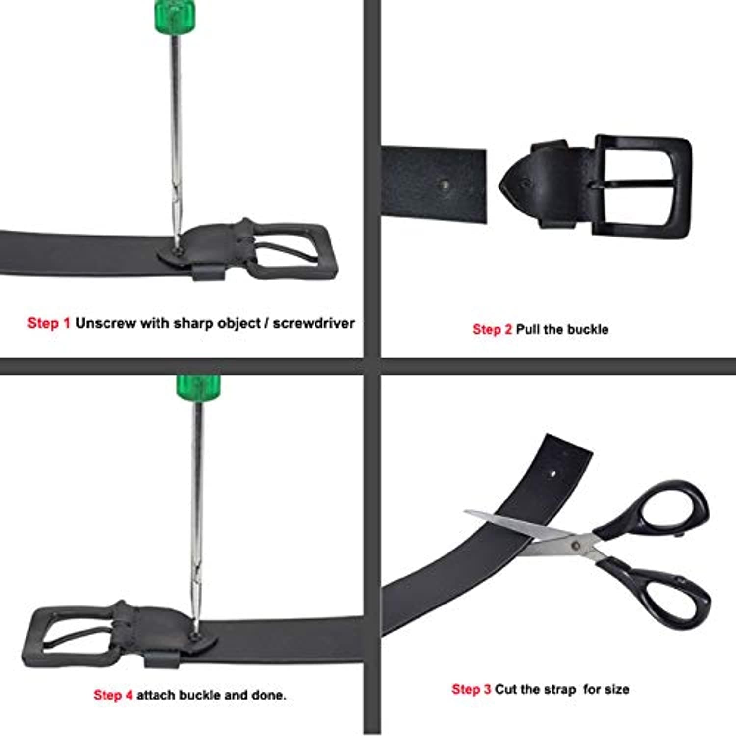 ADJUSTABLE SIZE BELT – In just 4 easy steps you can make the belt fit for your size. 1 – Unscrew the round screw with a sharp object. 2 – Remove the Screw and pull out the buckle. 3 – Cut the strap with a scissor for size. 4 – Attach the screw back with a sharp object and done! In just 4 simple steps your belt is ready.