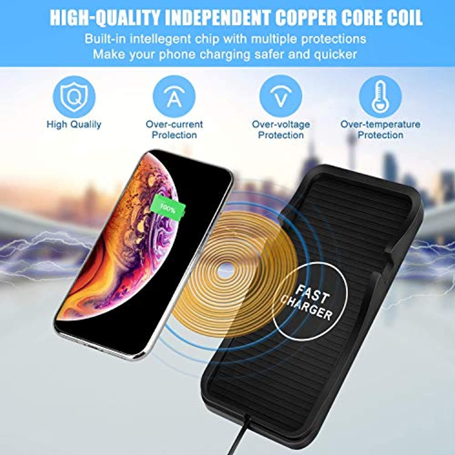 Wide Compatibility: This car wireless charger pad for car is compatible with all Qi wireless fast charging enabled smart phones, such as iPhone 11 X XR XS XS max 8 8 Plus, Samsung Galaxy S8 S9 Note 9/8/Note 7/Note 5/S6/S6 Edge/S6 Edge Plus/S6 Active/S7/S7 Edge/S8 /S8 Plus. Support 5W/ 7.5W/ 10W output power. Overvoltage protection, temperature control, overcurrent protection, and short circuit protection to ensure safely and quick charge your phone.