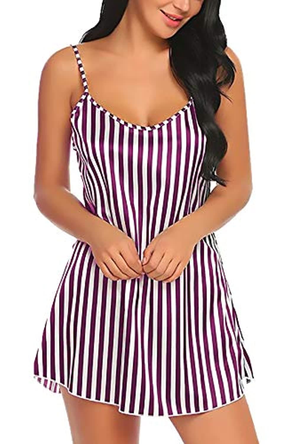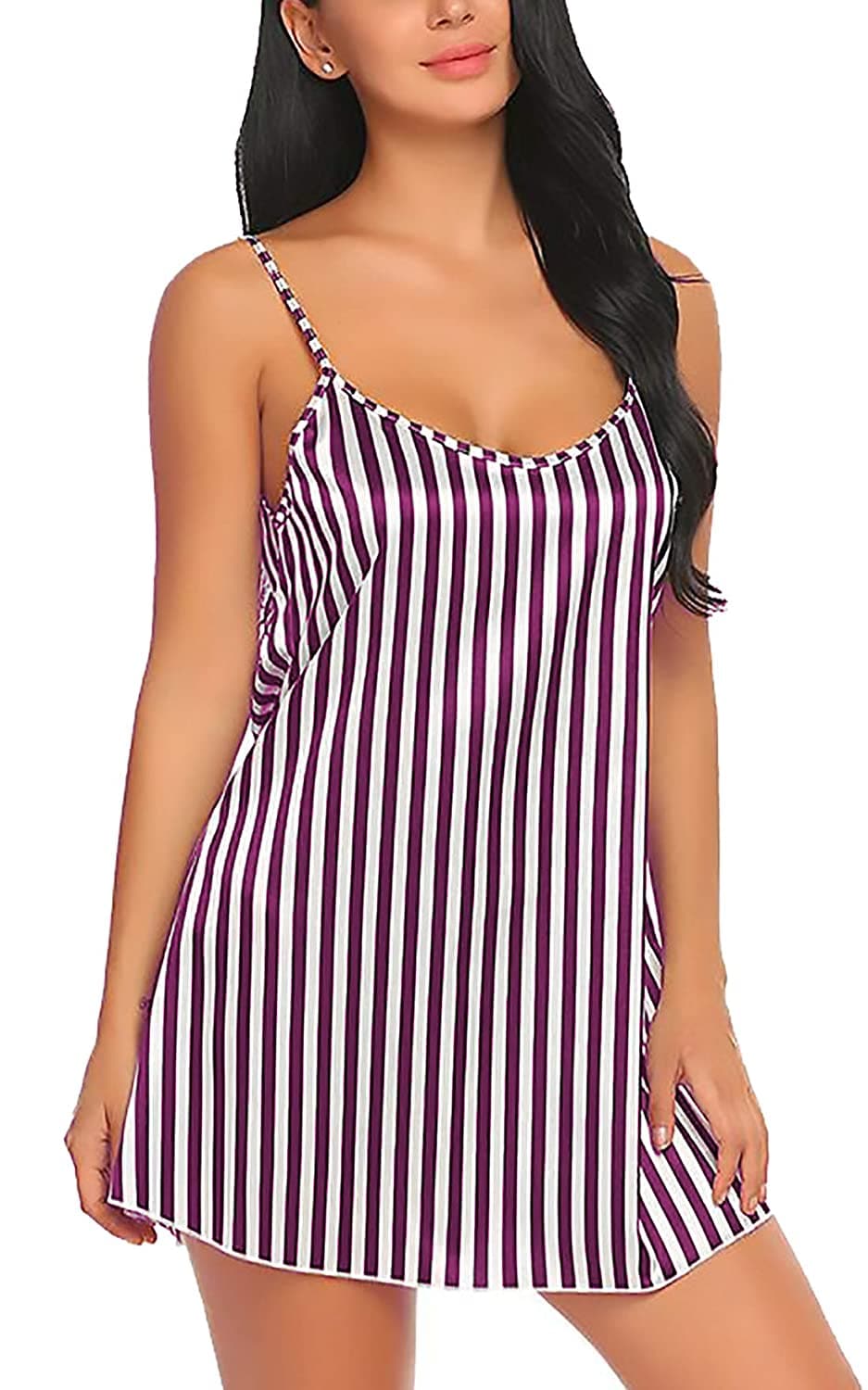 Women Stripe Satin Nightwear Lingerie Sleep Dress with Panty