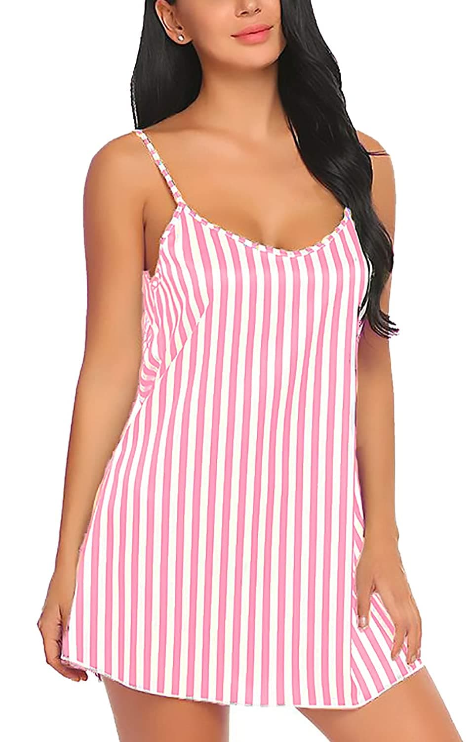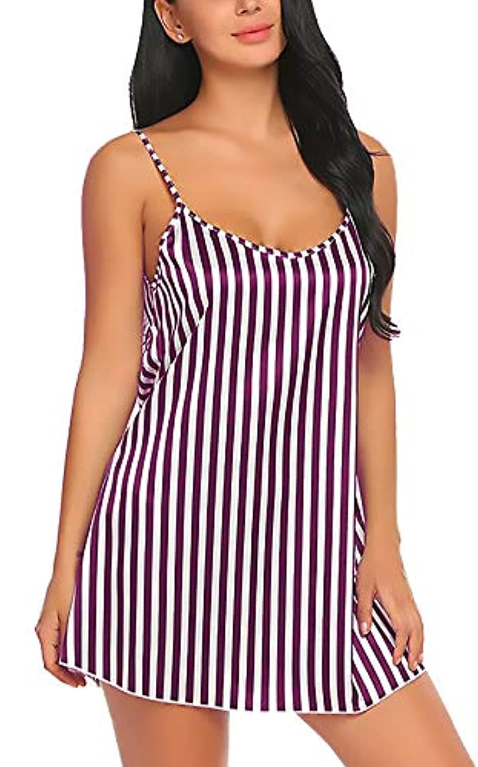 Style : Stripe design,V neck, Spaghetti strap, A-line style and short length. A beautiful babydoll nightgown.